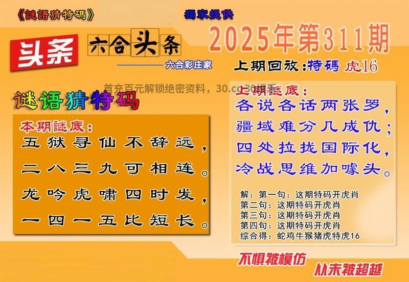 314期 今期生不力俱尽 蓝天碧海一片晴 六丛三八林满山 解得十五与二八 解译:蓝天碧海一片晴指天肖牛马龙兔猴猪,六丛三八林满山指山肖鼠虎兔羊猴鸡猪 九肖:牛马鼠虎兔羊猴鸡猪 六肖:牛马鼠虎兔羊 特码:17.29.24.36.18.30.16.28.15.27.23.35 |